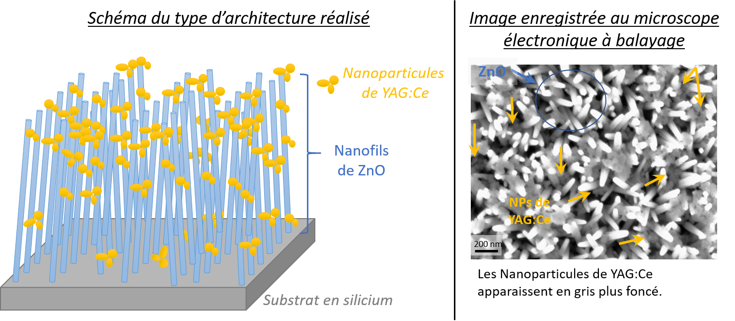 Ces échantillons associant nanofils de ZnO et céramique (YAG : Ce) ont permis de mettre en évidence une amélioration de l’intensité de luminescence pouvant aller jusqu’à 50% selon la configuration de l’architecture.