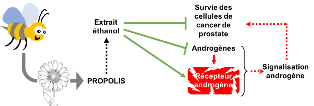 La propolis est un mélange de résine végétale et de cire fabriqué par les abeilles à partir de ce qui est collecté dans la nature. Ce composé complexe est utilisé par les abeilles à la fois comme mortier, pour étanchéifier la ruche, mais également comme agent anti-infectieux. Dans les pays tempérés, la propolis est riche en composés phénoliques et donc en agent antioxydants. Nos travaux montrent pour la première fois que la propolis réduit significativement et avec une grande efficacité la survie des cellules de cancer de la prostate à la fois en augmentant la mort cellulaire et en bloquant le cycle cellulaire. De plus, la propolis agit comme un puissant anti-androgène et diminue la quantité de récepteurs des androgènes dans les cellules en induisant sa destruction.