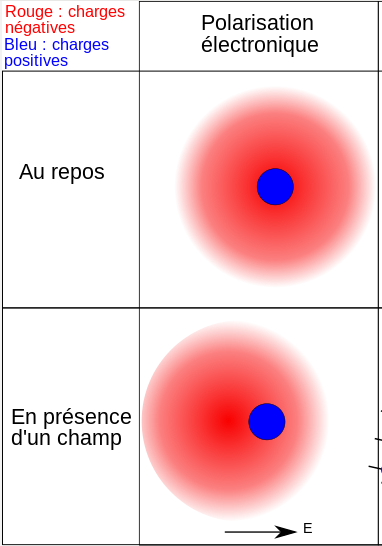 Schéma de la polarisabilité électrique d'un atome. Au repos, le centre des charges "+" (le noyau atomique, en bleu) et le centre des charges "-" (le cortège électronique, en rouge) coïncident. En présence d'un champ électrique E, les deux centres de gravité s'écartent l'un de l'autre, créant ce que l'on appelle un dipôle, caractérisé par une polarisabilité électrique.